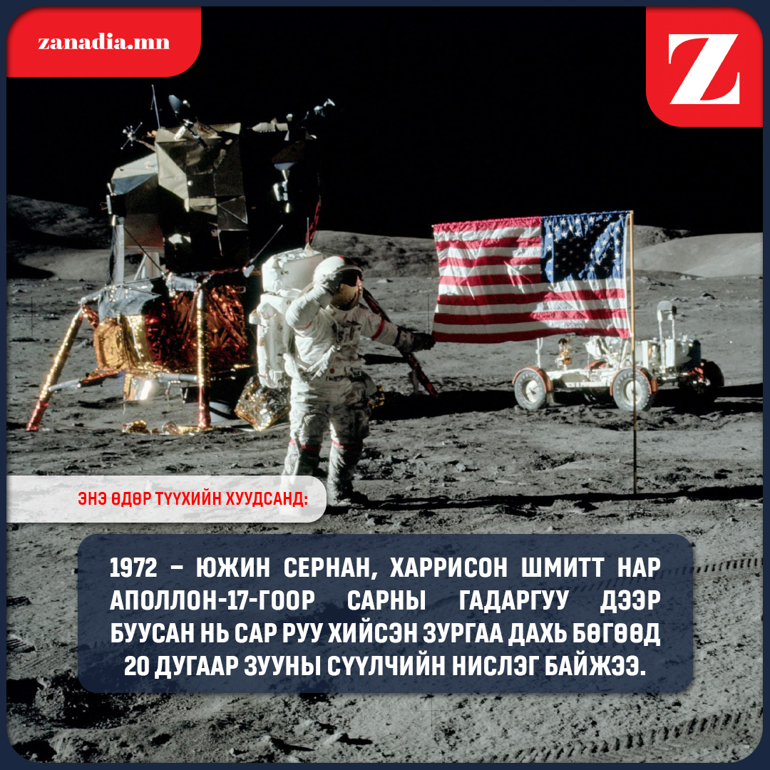Улс төр 1972 сар руу хийсэн зургаа дахь нислэг байжээ. admin December 11, 2025 0 1972 — Южин Сернан, Харрисон Шмитт нар Аполлон-17-гоор сарны гадаргуу дээр буусан нь сар руу хийсэн зургаа дахь бөгөөд 20 дугаар зууны сүүлчийн нислэг байжээ.